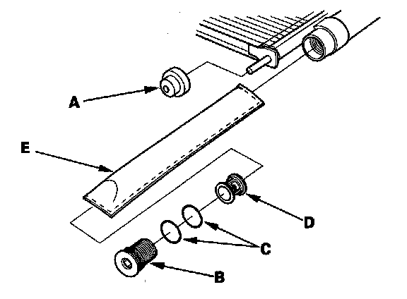 2. Remove the lower cushion (A), then remove the cap (B) from the bottom of the A/C condenser. Remove the O-rings (C), the filter (D) and the desiccant (E).