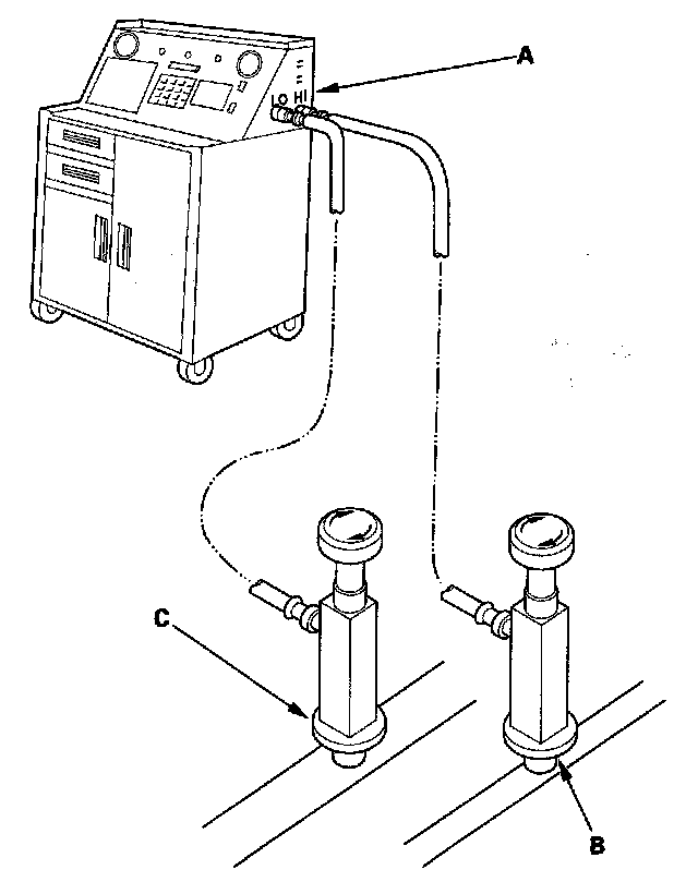 1. Connect an R-134a refrigerant recovery/recycling/charging station (A) to the high-pressure service port (B) and the low-pressure service port (C), as shown, following the equipment manufacturer's instructions.
