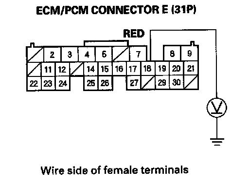 17. Using a backprobe set, measure the voltage between the No. 18 terminal of ECM/PCM connector E (31P) and body ground with the ECM/PCM connectors connected.