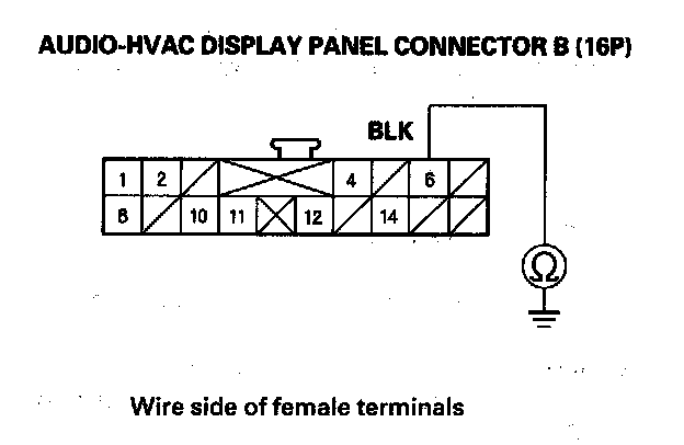 6. Check for continuity between the No. 6 terminal of audio-HVAC display panel connector B (16P) and body ground.