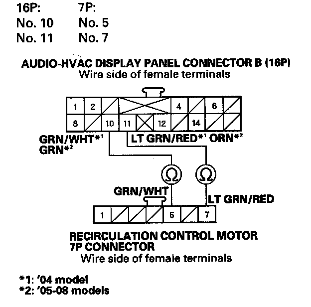 11. Check for continuity between the following terminals of audio-HVAC display panel connector B (16P) and the recirculation control motor 7P connector.