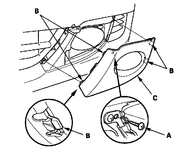 Remove the screw (A), and release all of the hooks (B) then remove the front fog light cover (C).