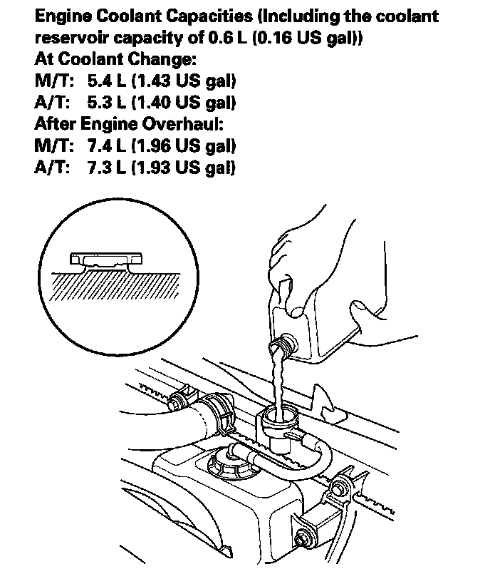 7. Pour Acura Long Life Antifreeze/Coolant Type 2 into the radiator up to the base of the filler neck.