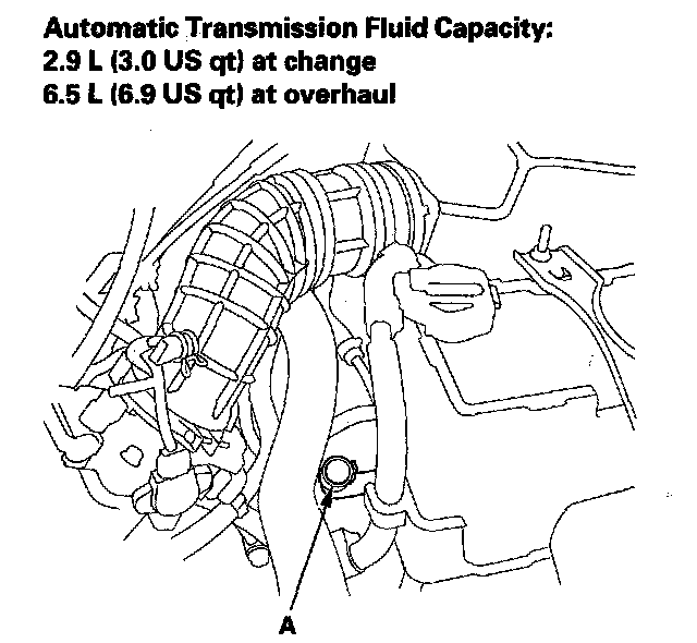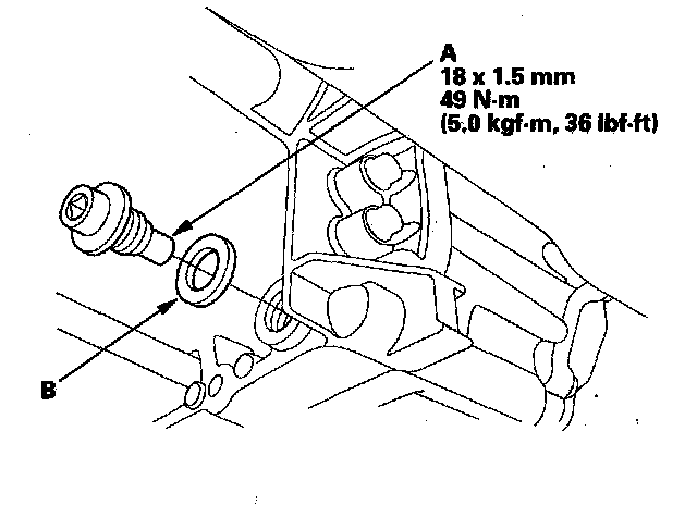3. Remove the drain plug (A), and drain the automatic transmission fluid (ATF). Then reinstall the drain plug with a new sealing washer (B).
