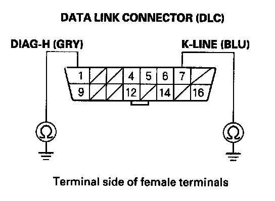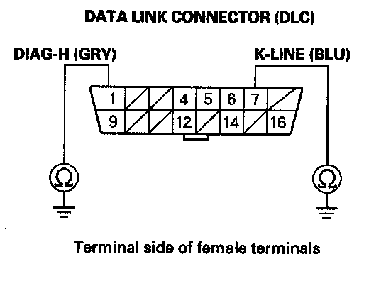 17. Check for continuity between body ground and DLC terminals No. 1 and No. 7 individually.