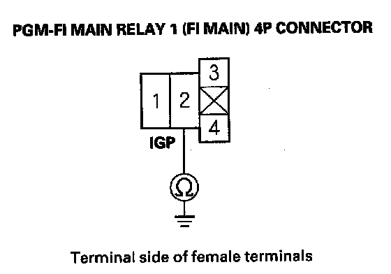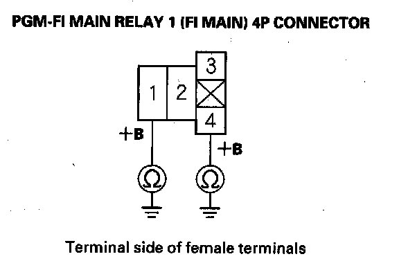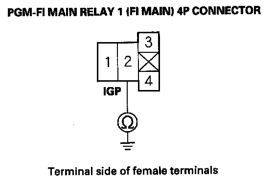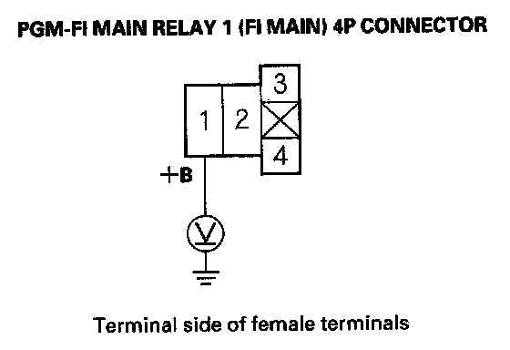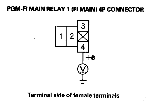 73. Measure voltage between PGM-FI main relay 1 (FI MAIN) 4P connector terminal No. 1 and body ground.