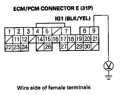 62. Measure voltage between ECM/PCM connector terminal E9 and body ground.