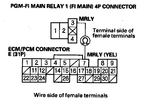 67. Check for continuity between PGM-FI main relay 1 (FI MAIN) 4P connector terminal No. 3 and ECM/PCM connector terminal E7.