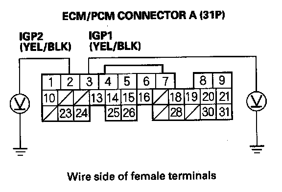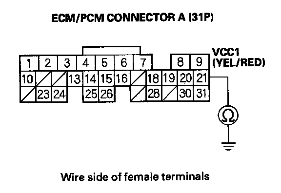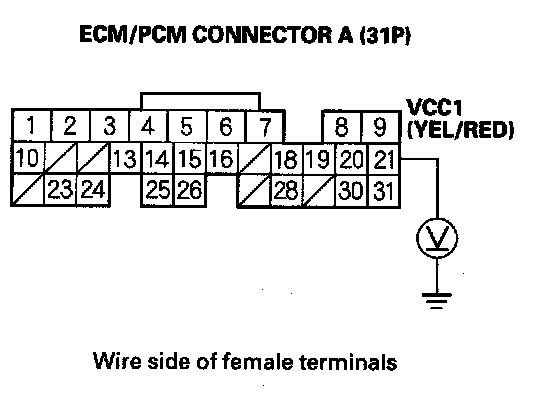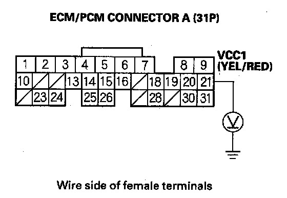 78. Disconnect the connector from each of these sensors, one at a time, and measure voltage between body ground and ECM/PCM connector terminal A21 with the ignition switch ON (II).