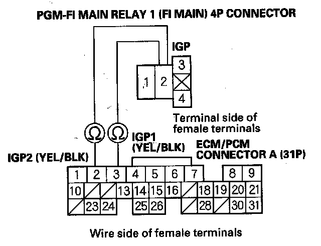74. Check for continuity between PGM-FI main relay 1 (FI MAIN) 4P connector terminal No. 2 and ECM/PCM connector terminals A2 and A3 individually.