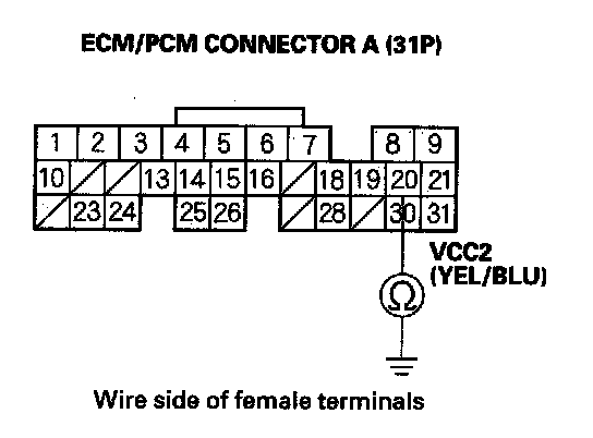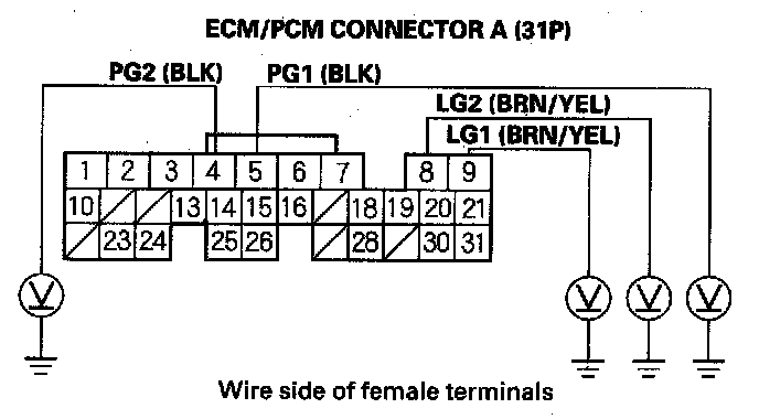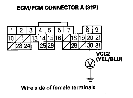 86. Disconnect the connector from each of these sensors, one at a time, and measure voltage between body ground and ECM/PCM connector terminal A20 with the ignition switch ON (II).