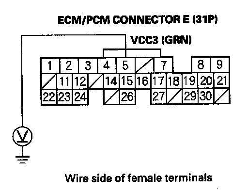 94. Disconnect the FTP sensor 3P connector, and measure voltage between body ground and ECM/PCM connector terminal E5 with the ignition switch ON (II).