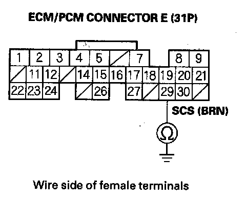 7. Check for continuity between ECM/PCM connector terminal E29 and body ground.