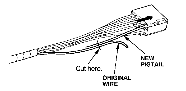 6. Lay the pigtail and the original wire side-by-side, and cut off both ends at once. If you are making more than one splice, do not cut each pigtail at the same location; the resulting "lump" of splice connectors would interfere with rewrapping the harness. Instead, cut the first pigtail close enough to the terminal so you will have room to make each remaining cut about 20 mm (3/4 inch) farther down on the next pigtail.