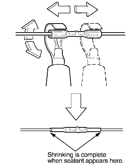 13. Plug in the heat gun, and turn it on. Start at the middle of the splice connector, and move the gun toward the ends as the tube shrinks. Apply heat evenly by rotating the curved heat spreader around the splice connector. Shrinking is complete when a small amount of sealant appears at each end of the tube.