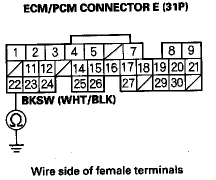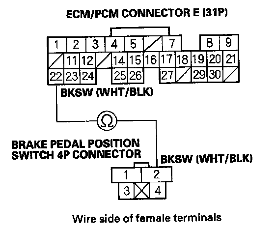 9. Check for continuity between ECM/PCM connector terminal E22 and brake pedal position switch 4P connector terminal No. 2.
