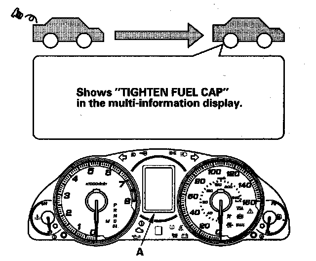 The first time a leak is detected a "TIGHTEN FUEL CAP" message appears in the multi-information display (A). To scroll to another message, press the select/reset button. The "TIGHTEN FUEL CAP" message will appear each time you restart the engine until the system turns the message off. Turn the engine off then replace or tighten the fuel fill cap until it clicks at least once.