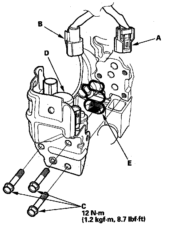 3. Remove the rocker arm oil control valve (VTEC solenoid valve) (D).