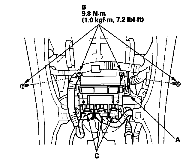 1. Install the new SRS unit (A) with TORX bolts (B), then connect the connectors (C) to the SRS unit; push them into position until they click.