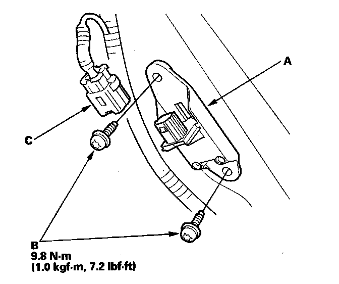 1. Install the new side impact sensor (second) (A) with the TORX bolts (B), then connect the side curtain airbag harness 2P connector (C) to the side impact sensor (second).
