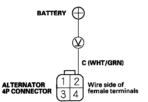 7. Measure the voltage between alternator 4P connector terminal No. 2 and the positive terminal of the battery.