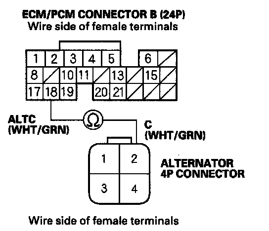 13. Check for continuity between ECM/PCM connector terminal B18 and alternator 4P connector terminal No. 2.