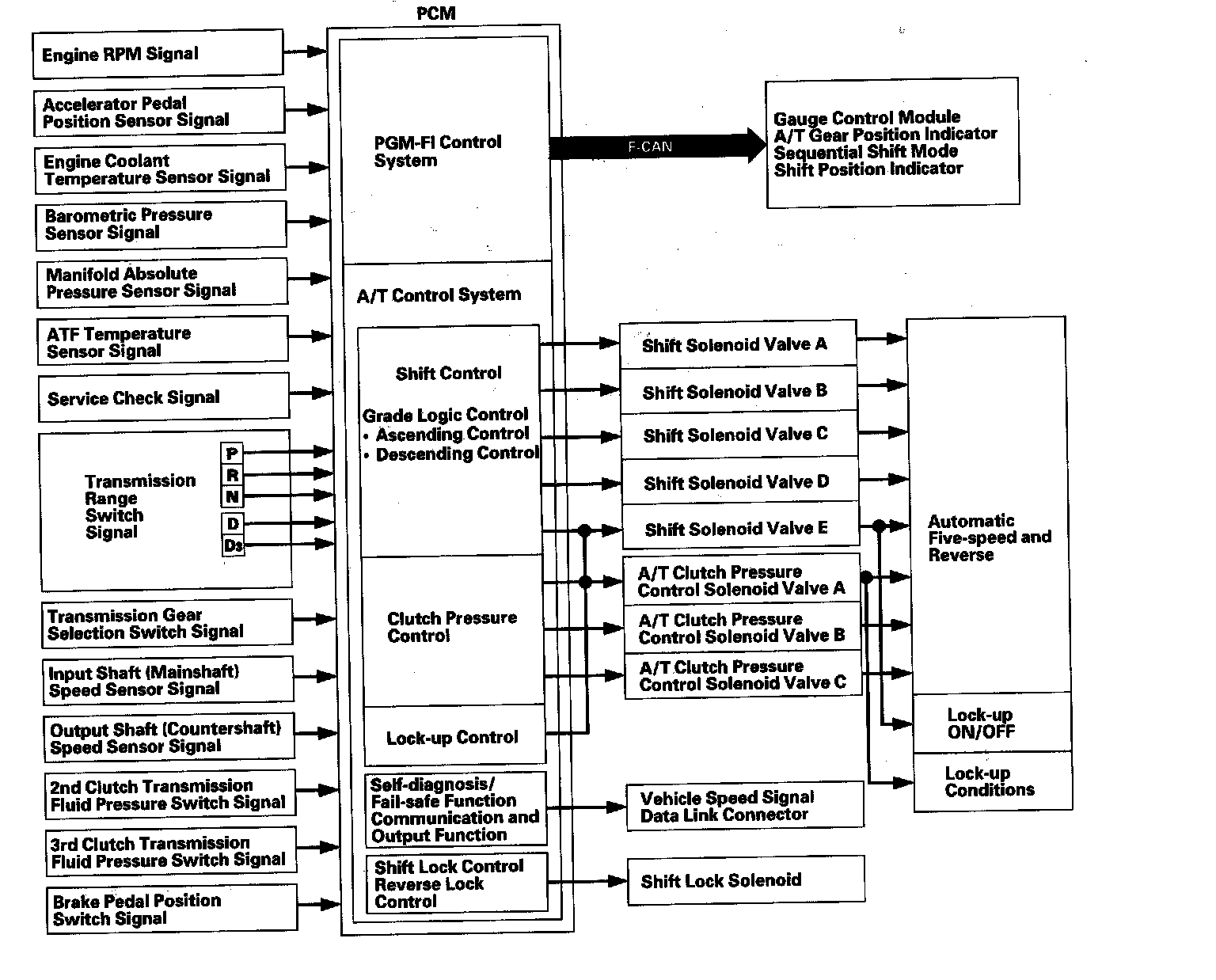 The electronic control system consists of the powertrain control module (PCM), the sensors, and the solenoid valves. Shifting and lock-up are electronically controlled for comfortable driving under all conditions.