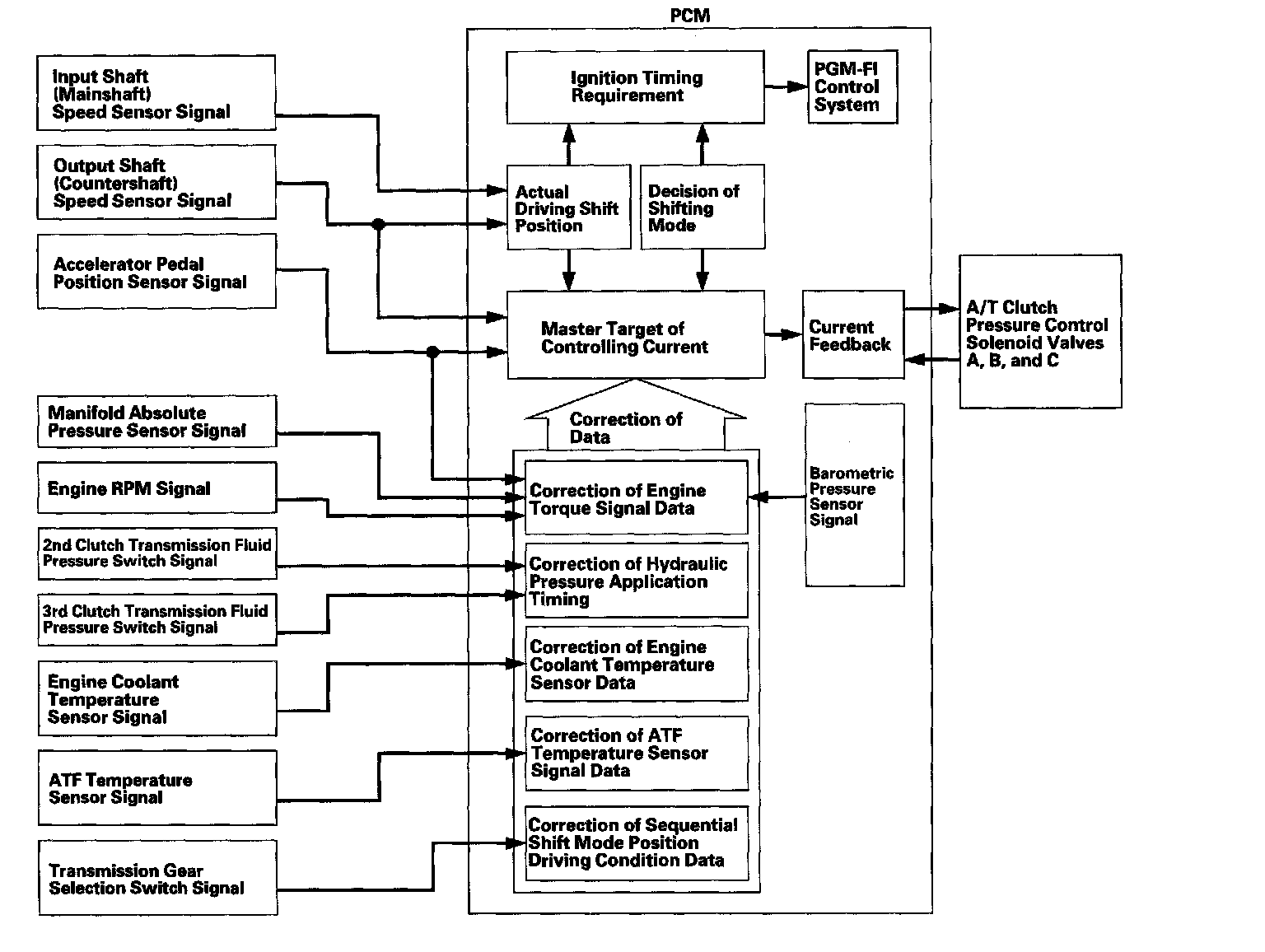 The PCM receives input signals from the various sensors and switches, processes data, and outputs current to A/T clutch pressure control solenoid valves A, B, and C.