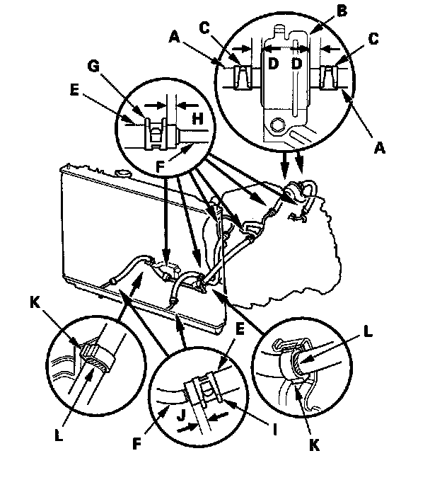3. Slide the ATF cooler hoses (E) over the ATF cooler lines (F).