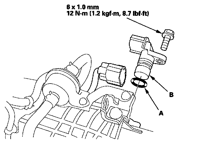 3. Install a new O-ring (A) on a new input shaft (mainshaft) speed sensor (B), then install the input shaft (mainshaft) speed sensor in the transmission housing.
