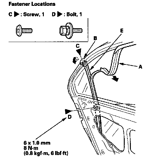 4. Pull the upper portion of the center channel (A) forward to remove it from the door quarter glass seal (B), then pull the glass run channel (C) out from the groove of the center lower channel. Take care not to damage the outer weatherstrip (D).