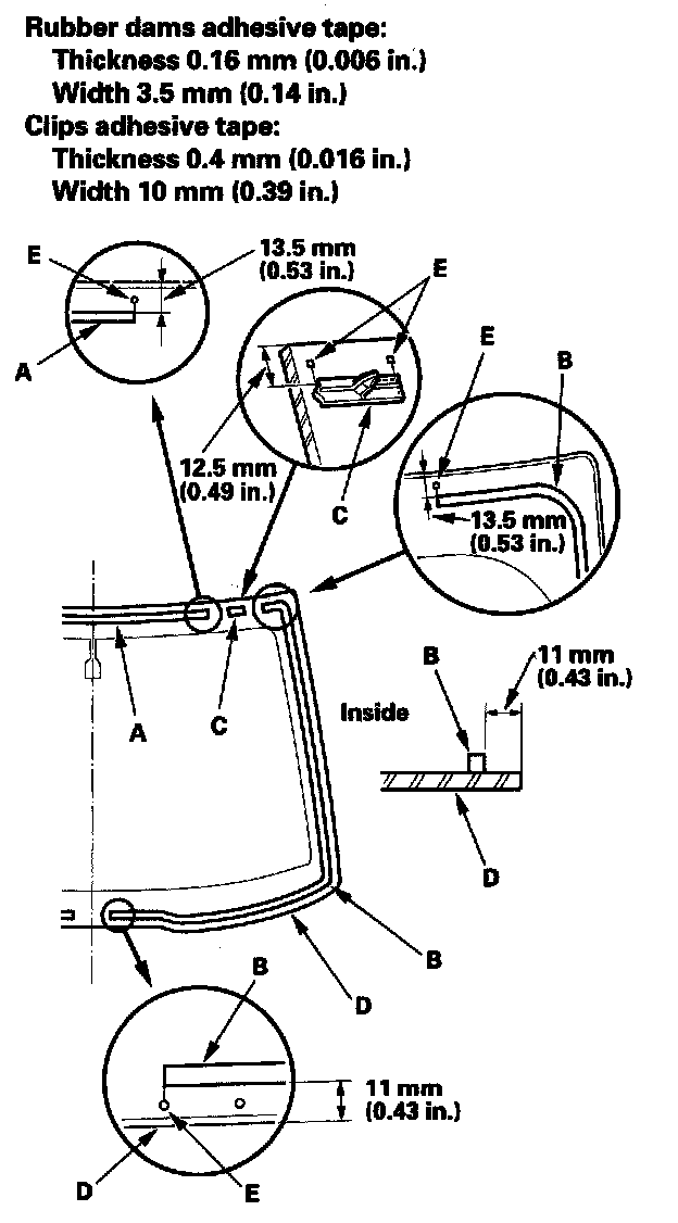 11. Attach the upper rubber dam (A), lower side rubber dam (B), and clips (C) with adhesive tape to the inside face of the windshield (D) as shown: