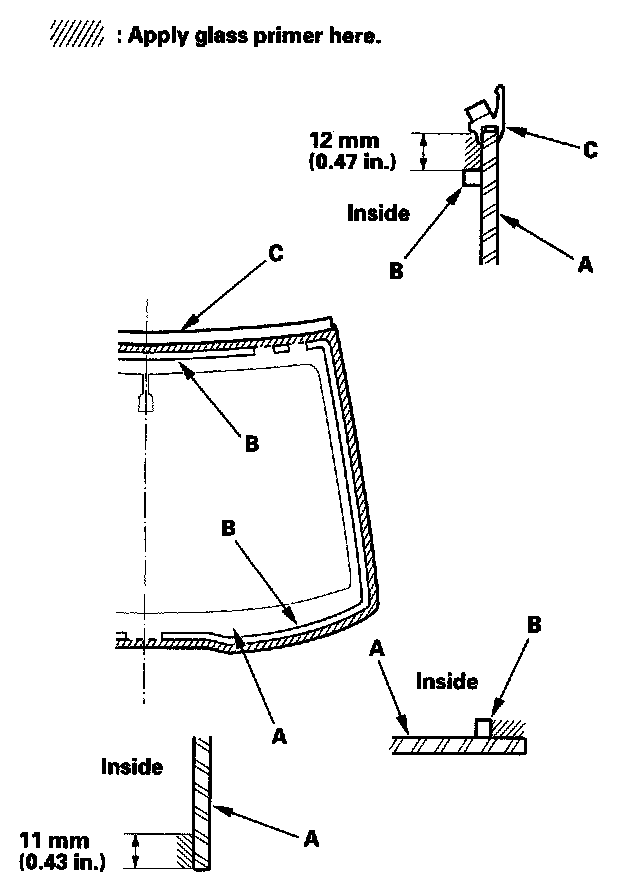 16. With a sponge, apply a light coat of glass primer around the edge of the windshield (A) between the dams (B) and molding (C) as shown, then lightly wipe it off with gauze or cheesecloth: