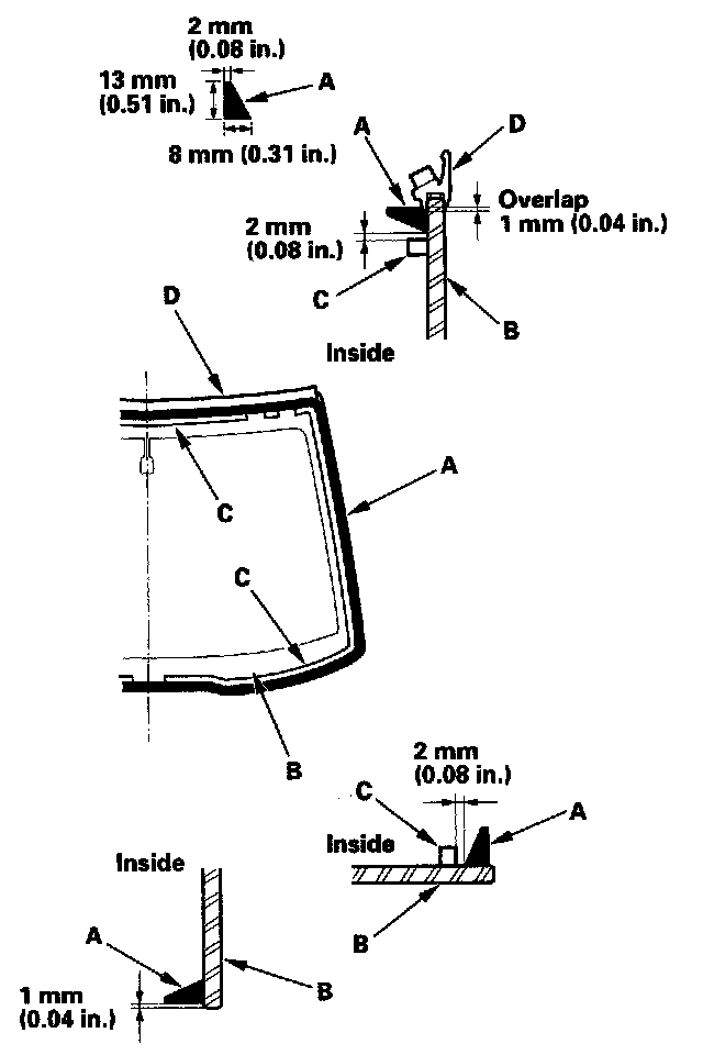 19. Put the cartridge in a caulking gun, and run a bead of adhesive (A) around the edge of the windshield (B) between the dams (C) and molding (D) as shown. Apply the adhesive within 30 minutes after applying the glass primer. Make a slightly thicker bead at each corner.