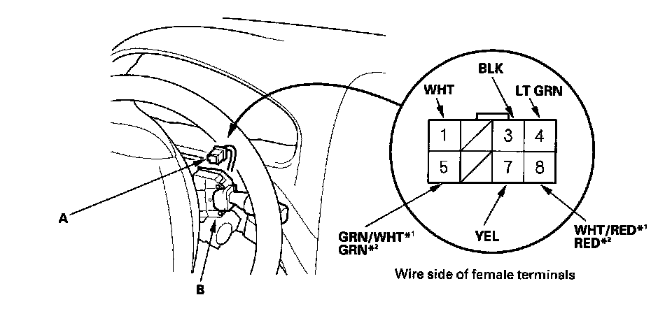 4. Disconnect the 8P connector (A) from the wiper/washer switch (B).