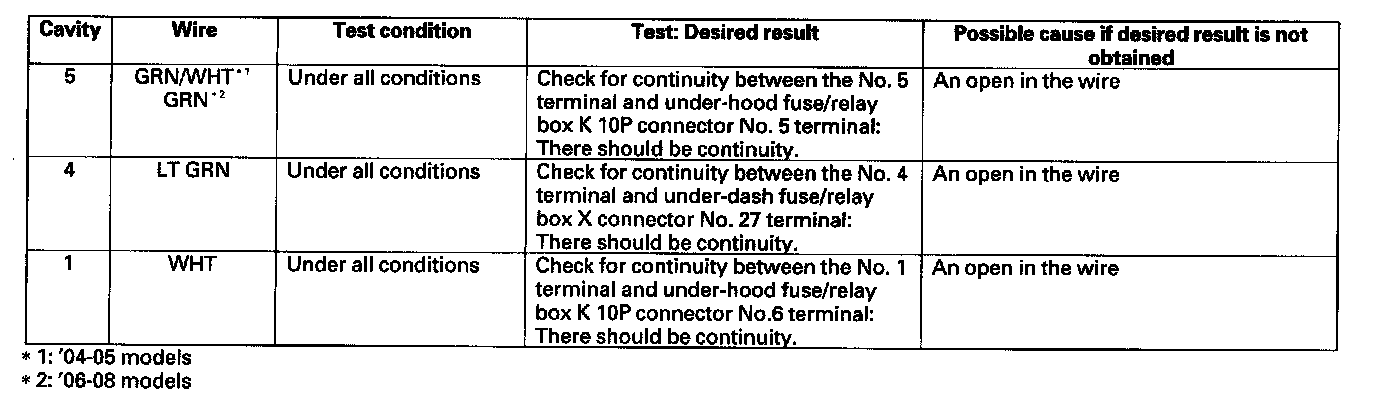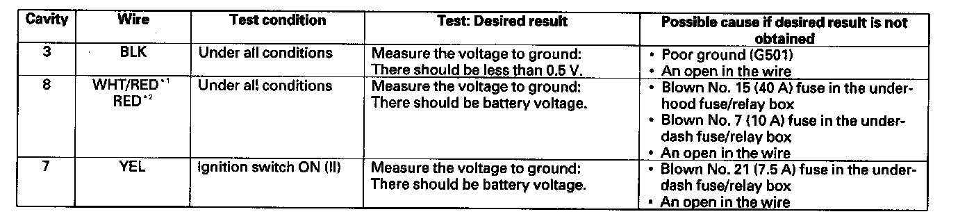 6. Reconnect the connector to the wiper/washer switch, and make these input tests at the connector.