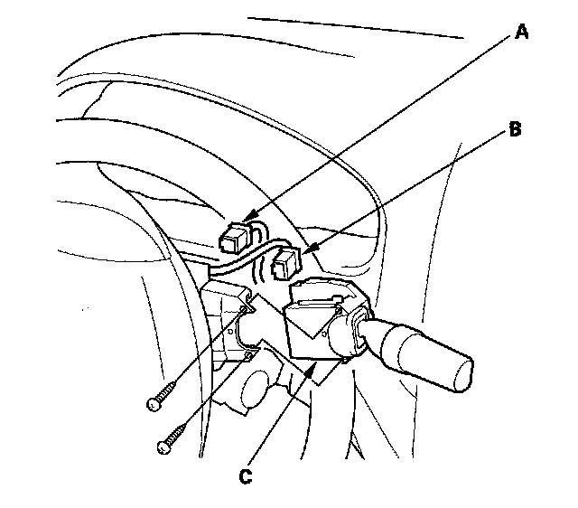 3. Disconnect the combination light switch 12P connector (A) and dashboard wire harness 8P connector (B) from the wiper/washer switch (C).