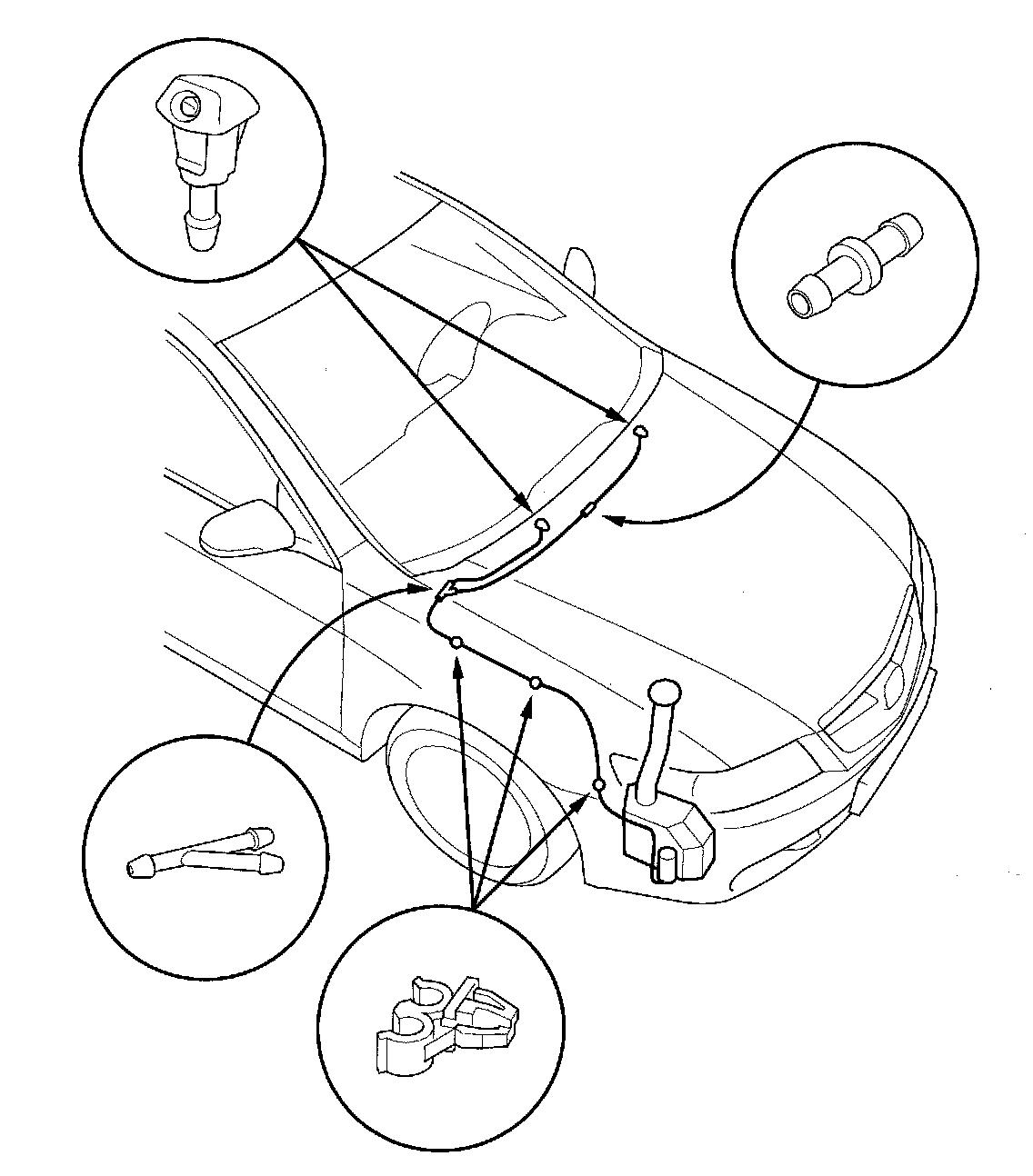 Remove the windshield washer nozzles and clips, then remove the tube.