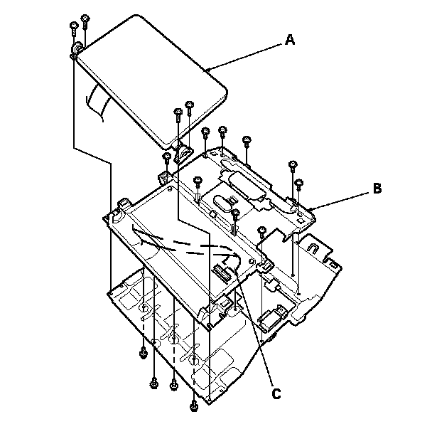 7. Remove the screws, then remove the screen (A) and base (B). Disconnect the cable (C).