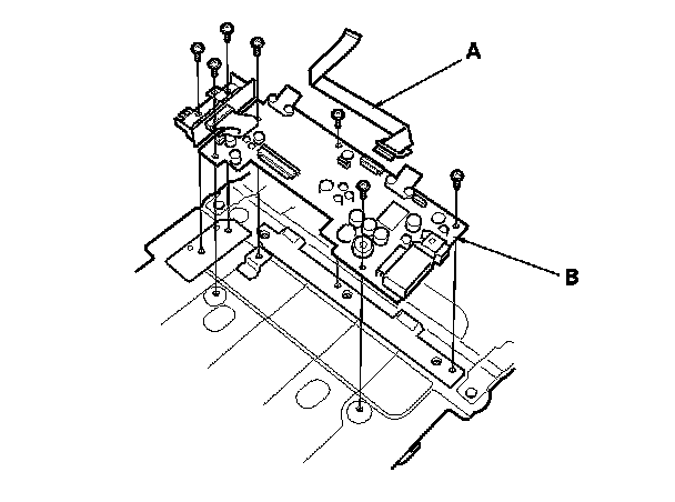 9. Disconnect the cable (A), then remove the screws and the rear control main printed circuit board (B).