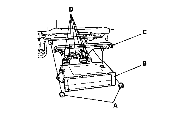 6. Remove the cover (C), then disconnect the navigation unit connectors (D).