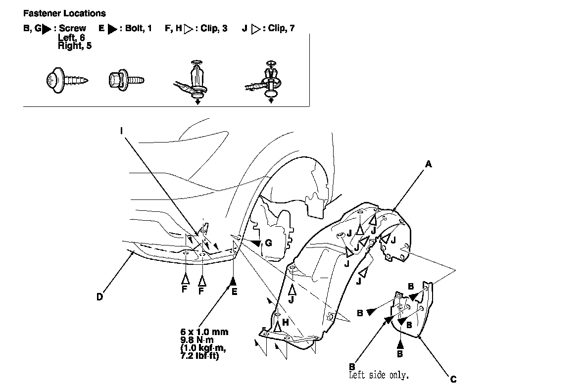 -4 From the wheel arch, remove the clip (H) securing the front splash shield (I) and front inner fender, and remove the clips (J) securing the front inner fender on the body.
