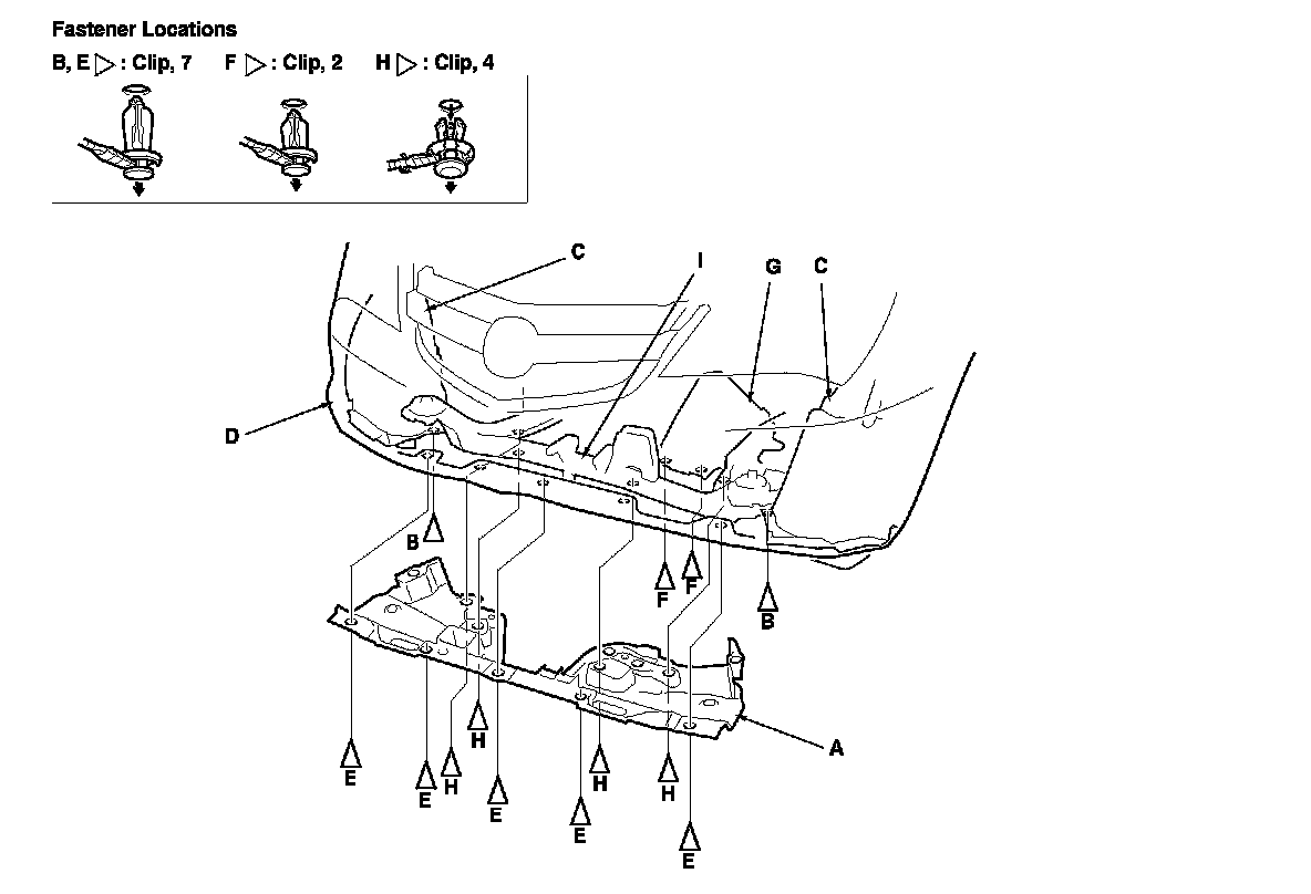-3 From under the body, remove the clips (F) that secure the front undercover (G) and splash shield, and remove the clips (H) that secure the splash shield on the front suspension subframe (I).