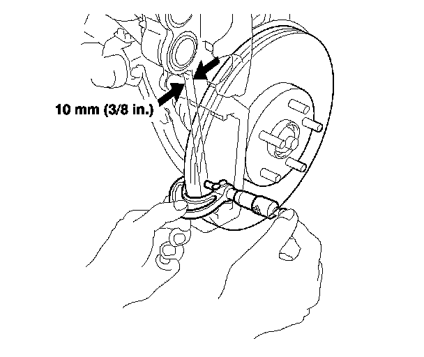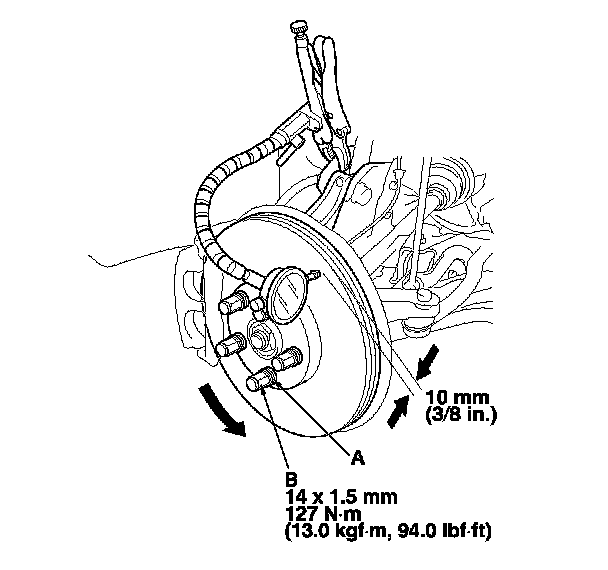 6. Set up the dial gauge against the brake disc as shown, and measure the runout at 10 mm (3/8 in.) from the outer edge of the brake disc.