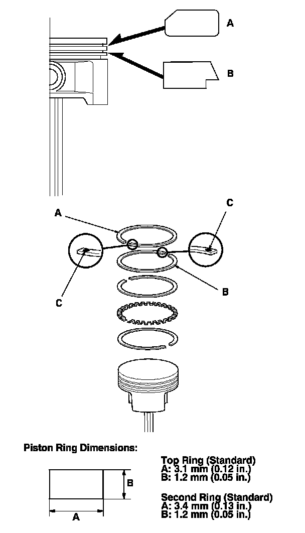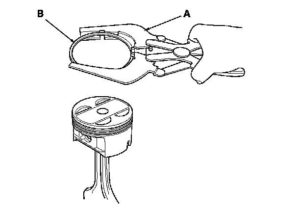 5. Measure the piston ring end-gap (B) with a feeler gauge: