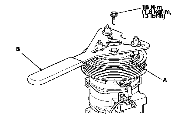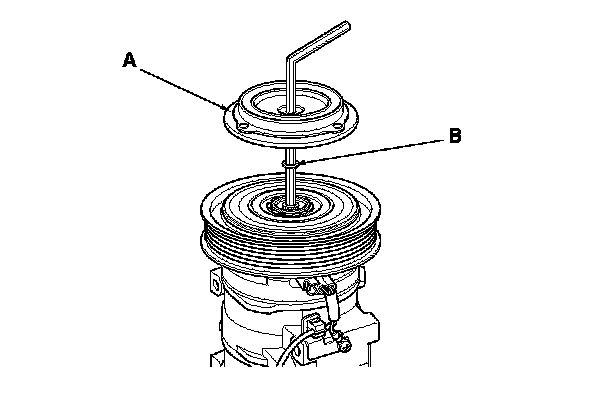 1. Remove the center bolt while holding the pressure plate (A) with a commercially available A/C clutch holder (B).