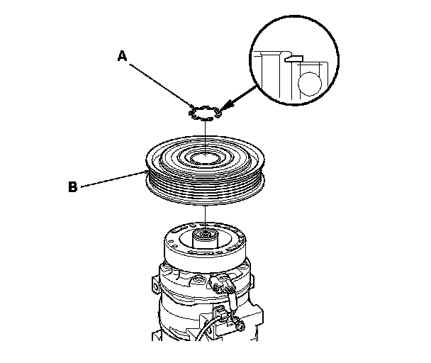 3. If you are replacing the field coil, remove the snap ring (A) with snap ring pliers, then remove the pulley (B). Be careful not to damage the pulley or the A/C compressor.