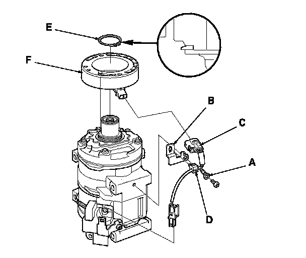 4. Remove the screw from the field coil ground terminal (A) and bracket (B). Disconnect the connector (C) from the field coil, then remove the wire harness clip (D). Remove the snap ring (E) with snap ring pliers, then remove the field coil (F). Be careful not to damage the field coil or the A/C compressor.