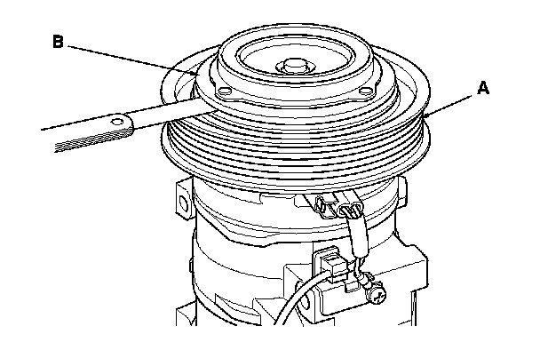 3. Measure the clearance between the pulley (A) and the pressure plate (B) all the way around. If the clearance is not within specified limits, remove the pressure plate Service and Repair and add or remove shims as needed to increase or decrease clearance.