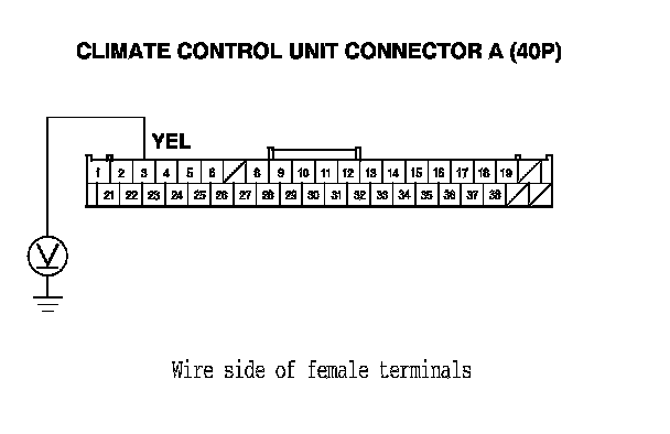 3. Measure the voltage between climate control unit connector A (40P) terminal No. 3 and body ground.